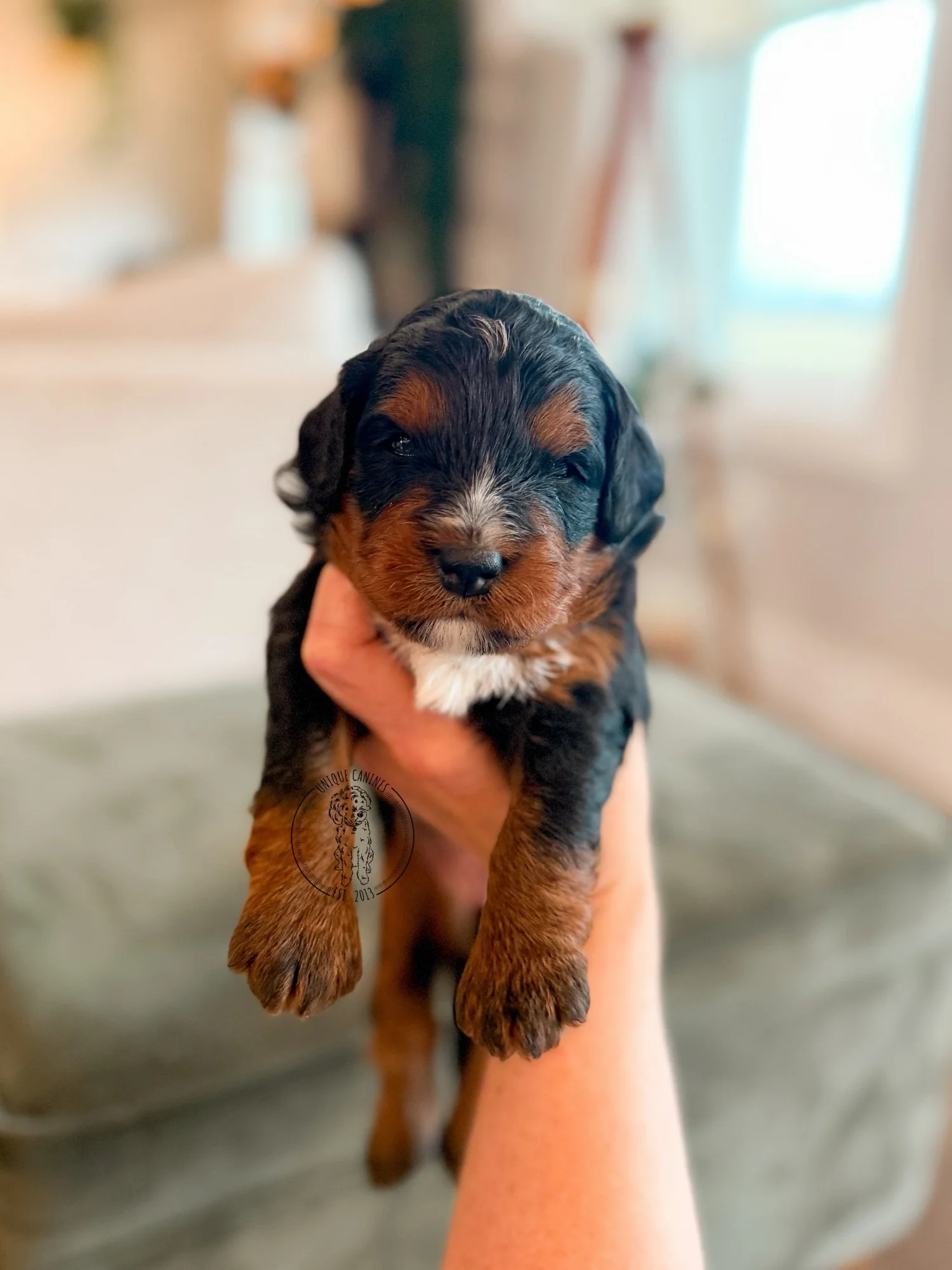Halo lives up to her name. She’s the calm one in a busy litter — gentle, observant, and the first to settle in for a cuddle. A natural fit for families who want a dog with a quiet kind of sweetness.